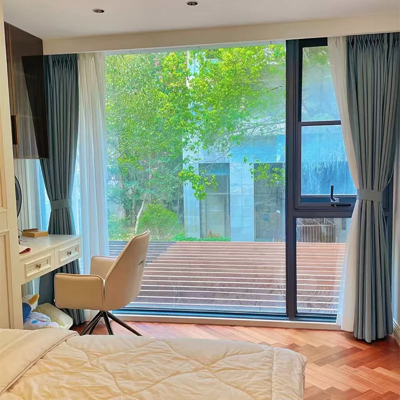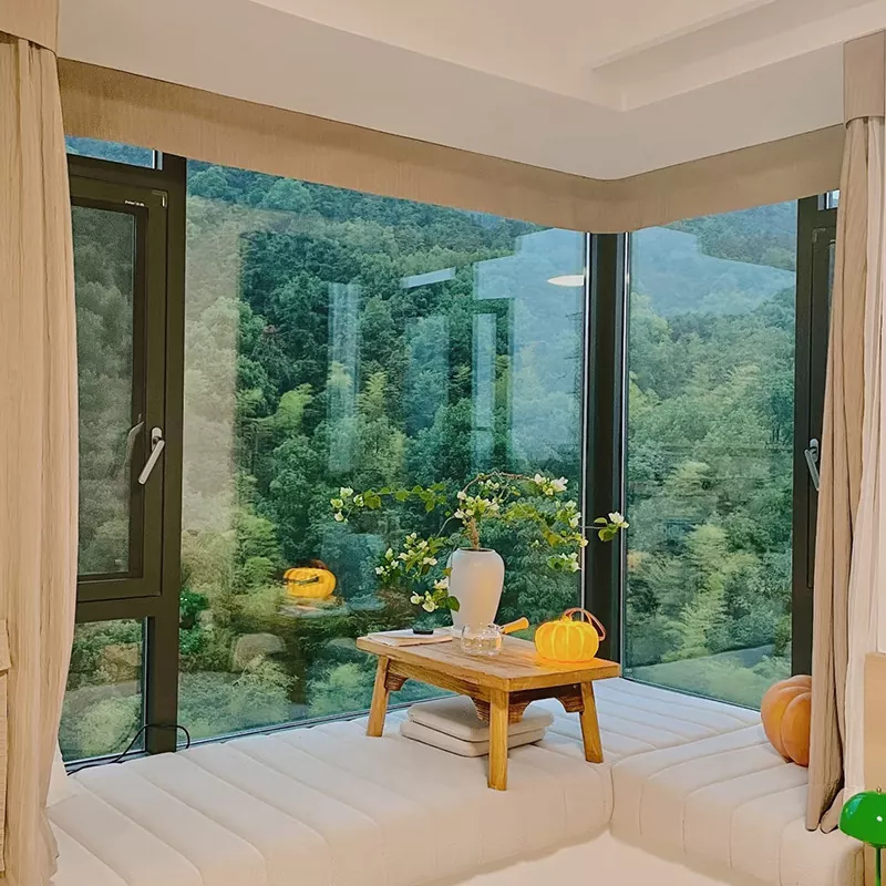 Konstrukcijoje yra „anoduoto aliuminio lydinio rėmo + grūdinto stiklo“ konstrukcija su integruotu kampiniu mazgu tolygiai paskirstyti įtampą, užtikrinant stabilumą išlaikant lengvą rėmą. Langai su langais yra įrengti išoriniai arba paslėpti aliuminio lydinio vyriai, atsidarantys 90° kampu ir sandarūs uždarant. Slydimas langai turi tylią bėgių sistemą, kuri sklandžiai slysta, sumažina triukšmą ir taupo erdvę – idealiai tinka mažiems butai.