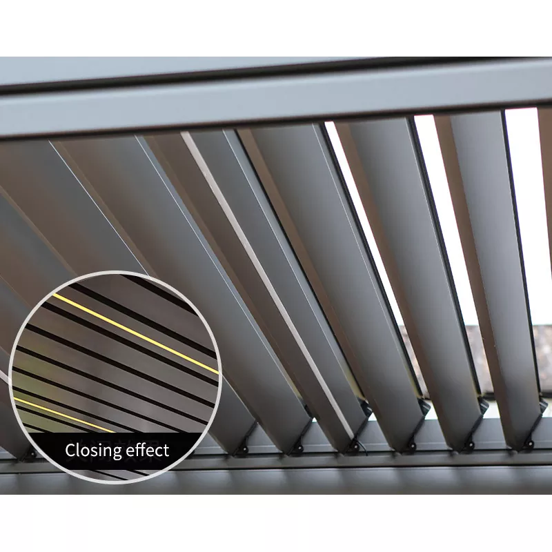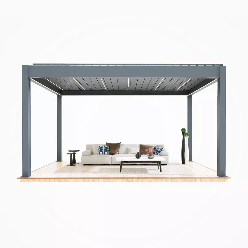 Pagrindinis išmaniojo valdymo paviljono pranašumas slypi „minimalistinėje estetikoje + išmaniajame branduolyje“. Remiantis supaprastintu linijos dizainu, jis nepastebimai integruoja tokius modulius kaip išmanusis skėčiai nuo saulės, apšvietimas ir vėjo bei lietaus indukcija, išlaikant skaidrią ir tvarkingą minimalistinę išvaizdą ir pasiekiamas visiškas automatinis valdymas. Pagrindinis korpusas pagamintas iš lengvo aliuminio lydinio profilių su matine fluoro anglies danga, subalansuojančia atsparumą oro sąlygoms, atsparumą korozijai ir tekstūrą. Išmanieji komponentai turi IP65 vandeniui atsparų dizainą, prisitaikydami prie sudėtingos lauko aplinkos. Jis gali būti valdomas nuotoliniu būdu per APP ir valdomas balso komandomis, realizuojant tokias funkcijas kaip automatinis skėčio atidarymas ir uždarymas, laipsniškas apšvietimo keitimas ir automatinis užsidarymas, reaguojant į vėją ir lietų, subalansuojant patogumą ir technologinę prasmę.