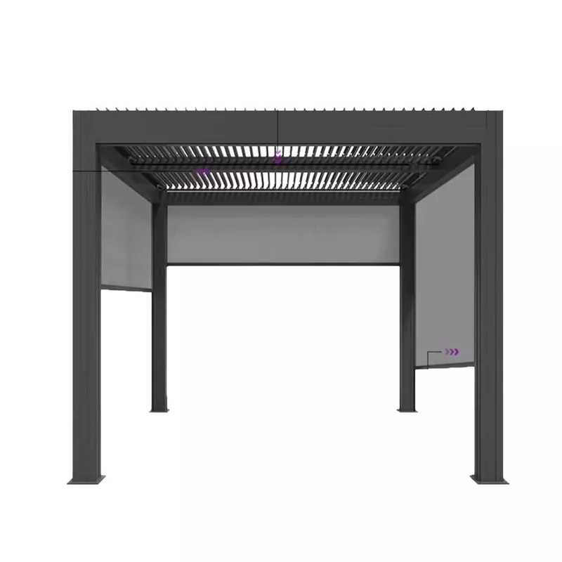 Courtyard Intelligent Pavilion (3000×3000mm): 60×60mm kolonos, grūdinto stiklo stogas + išmanus skėtis nuo saulės, tinka privatiems kiemams;
